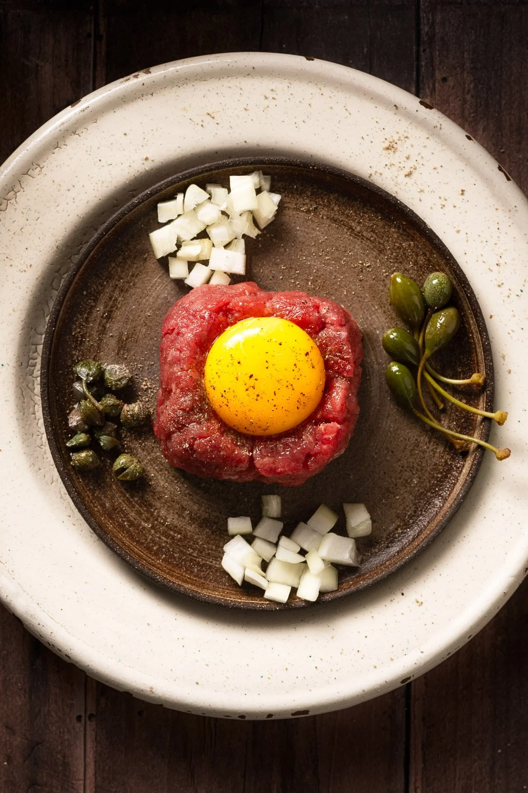 beef raw tartare with condiments and raw egg yolk, capers, mustard, caper fruits