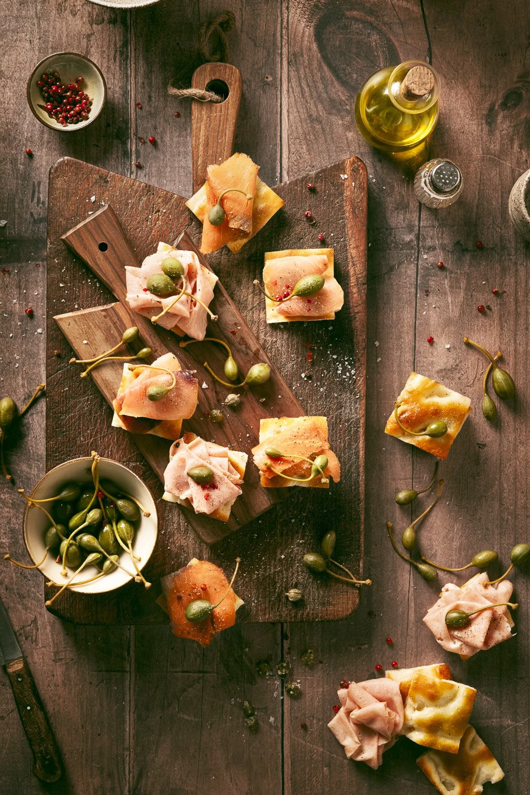 bruschetta cucunci, caper flower, caper, pepper, chilly, focaccia, caper fruit,