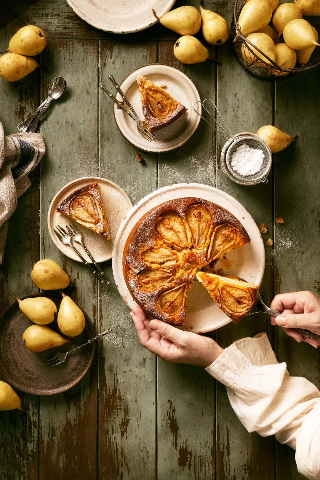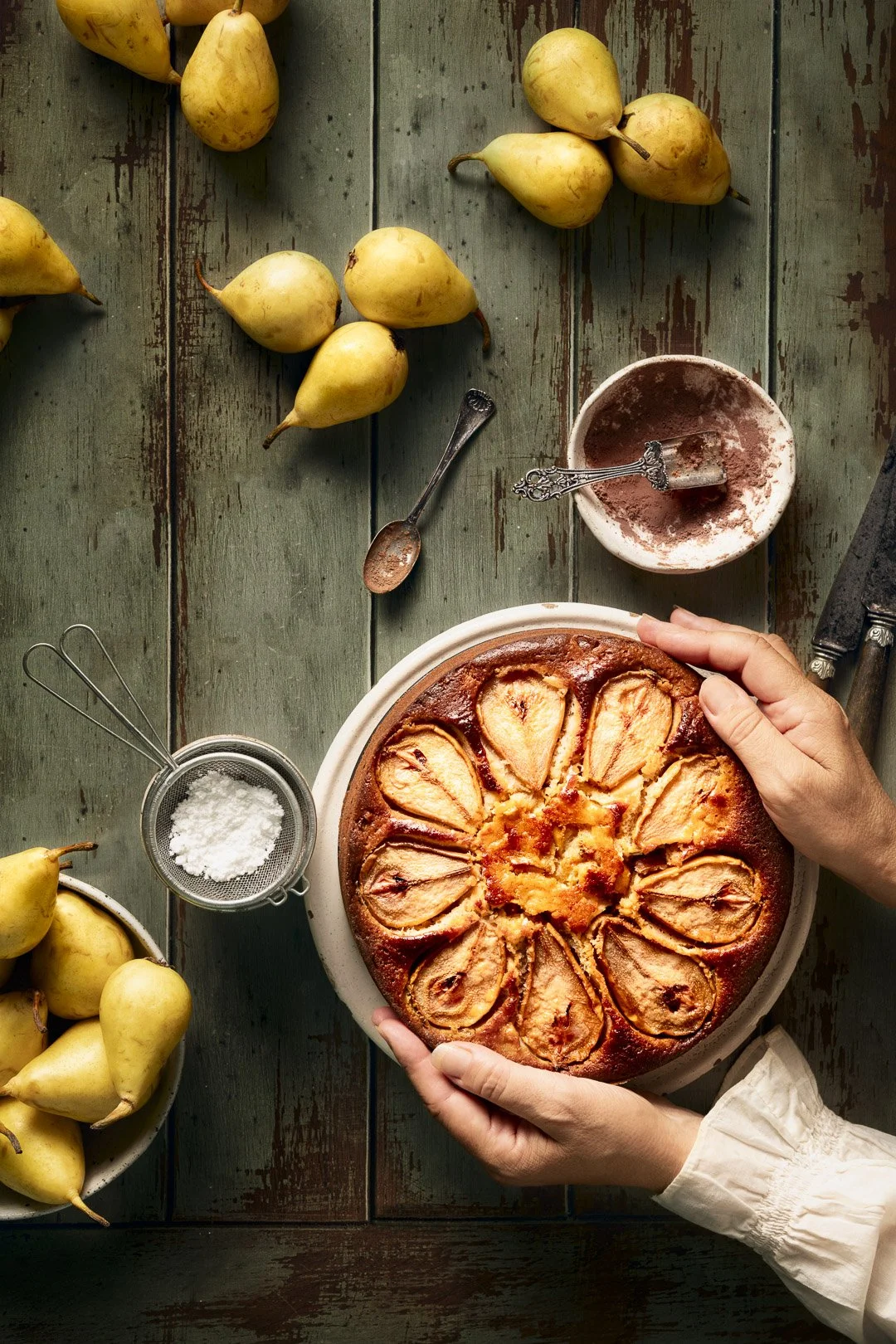 pear, cake, dessert, home made, sweet, fresh, baked, hand, plate, organic, icing sugar