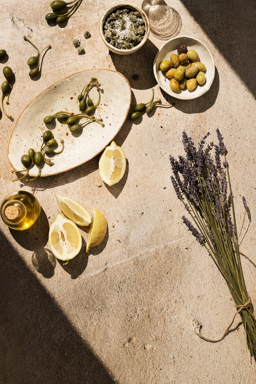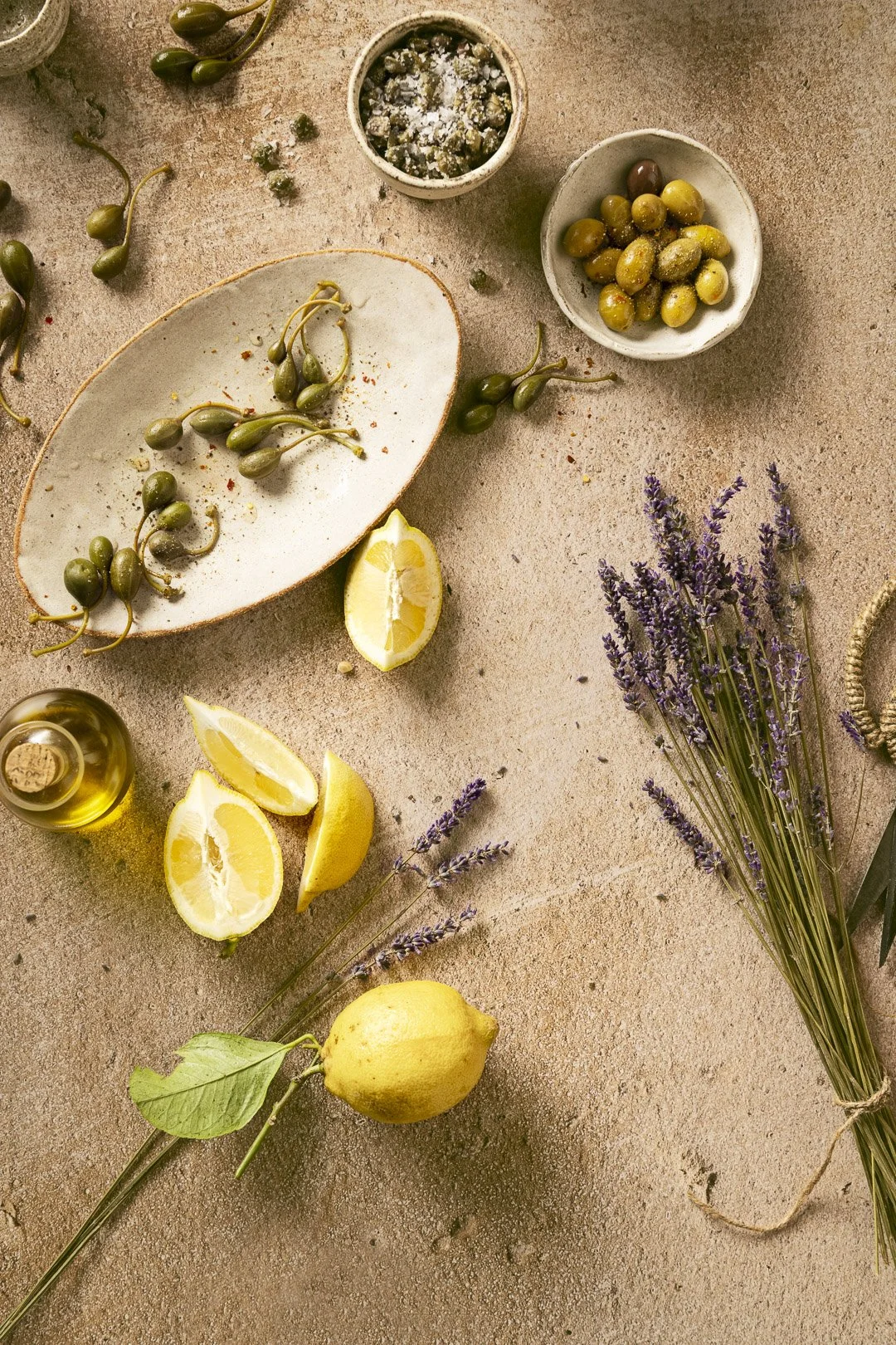 caper, caper fruit, cucunci, lavender, olives, aromatherapy, lemon, high key, summer