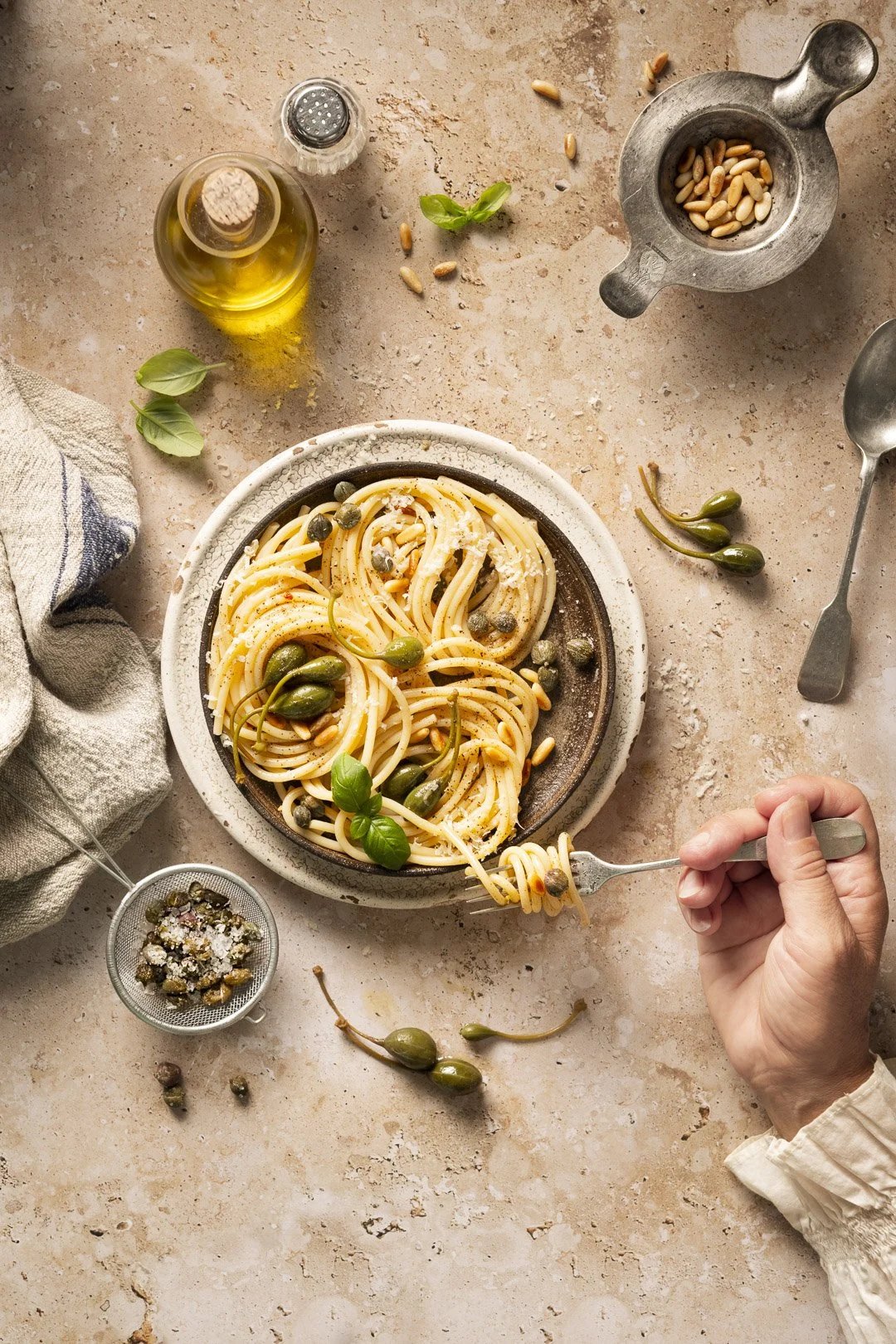 pasta, spaghetti, eolian sicilian, regional, hand, caper fruit, pine nuts, parmesan
