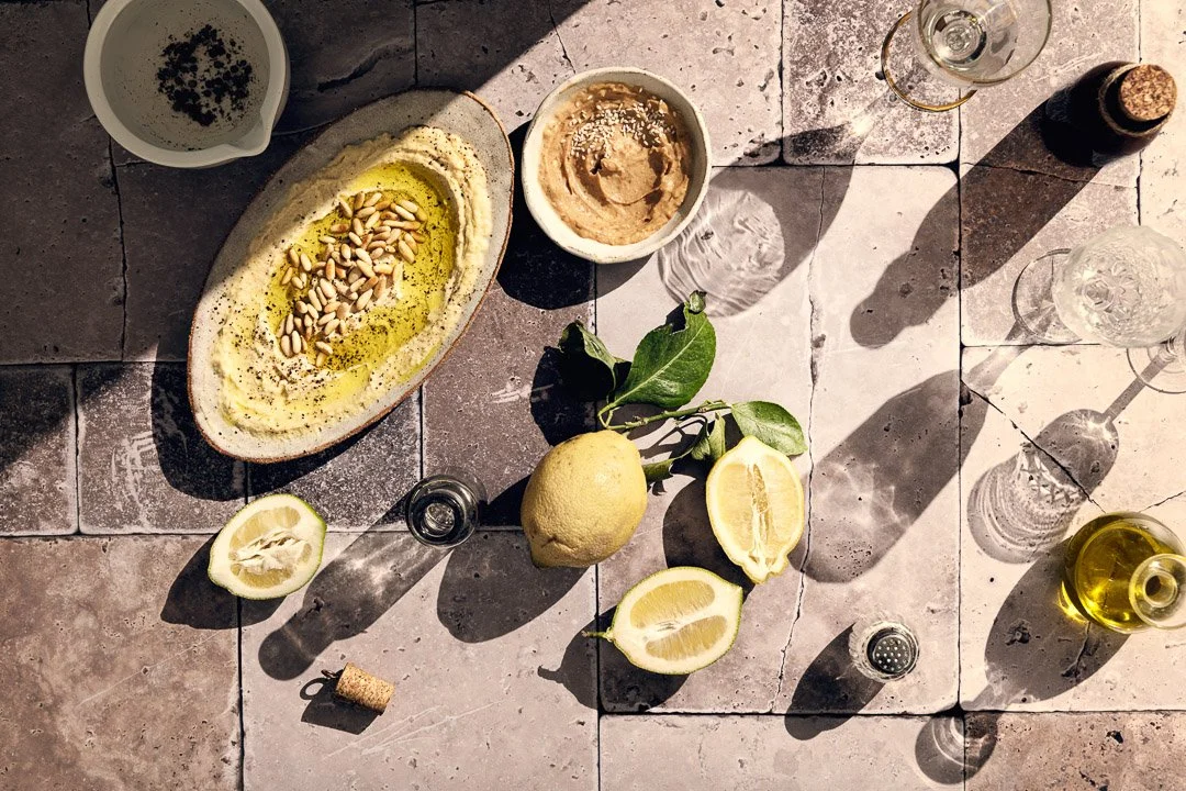 hummus, high key, hard light, pine nuts, wine glasses, miso sauce, lemon,